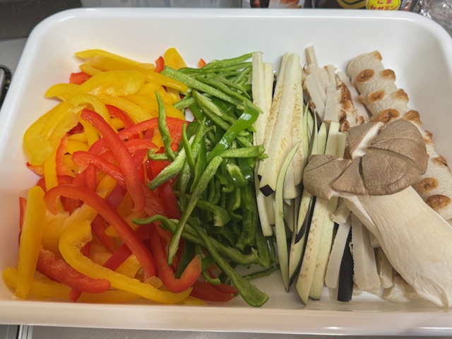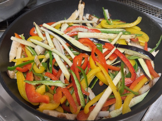 - ピーマン、パプリカ、ナスは細切り、エリンギは裂く。