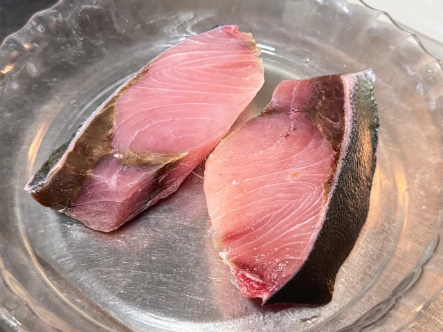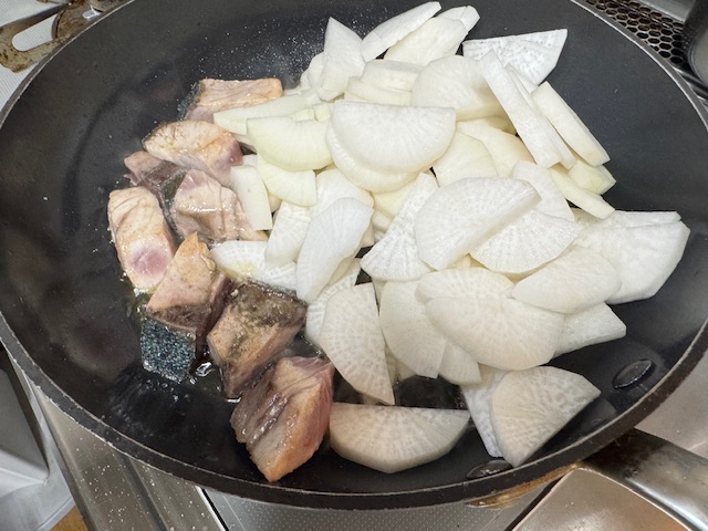 - フライパンにゴマ油を熱し、一口大に切り、塩、コショウをしたブリを入れて、表面を焼いたら、大根を加えて、全体に油をなじませる。