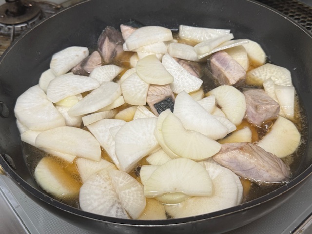 - 大根は皮をむき、5ミリ厚さの半月切りにする。