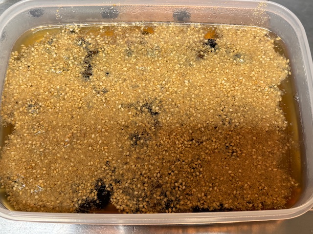 - 保存容器に①を流し入れたら、黒豆を入れて均等になるようにし、さらにすりゴマを表面に均等に振り掛ける。