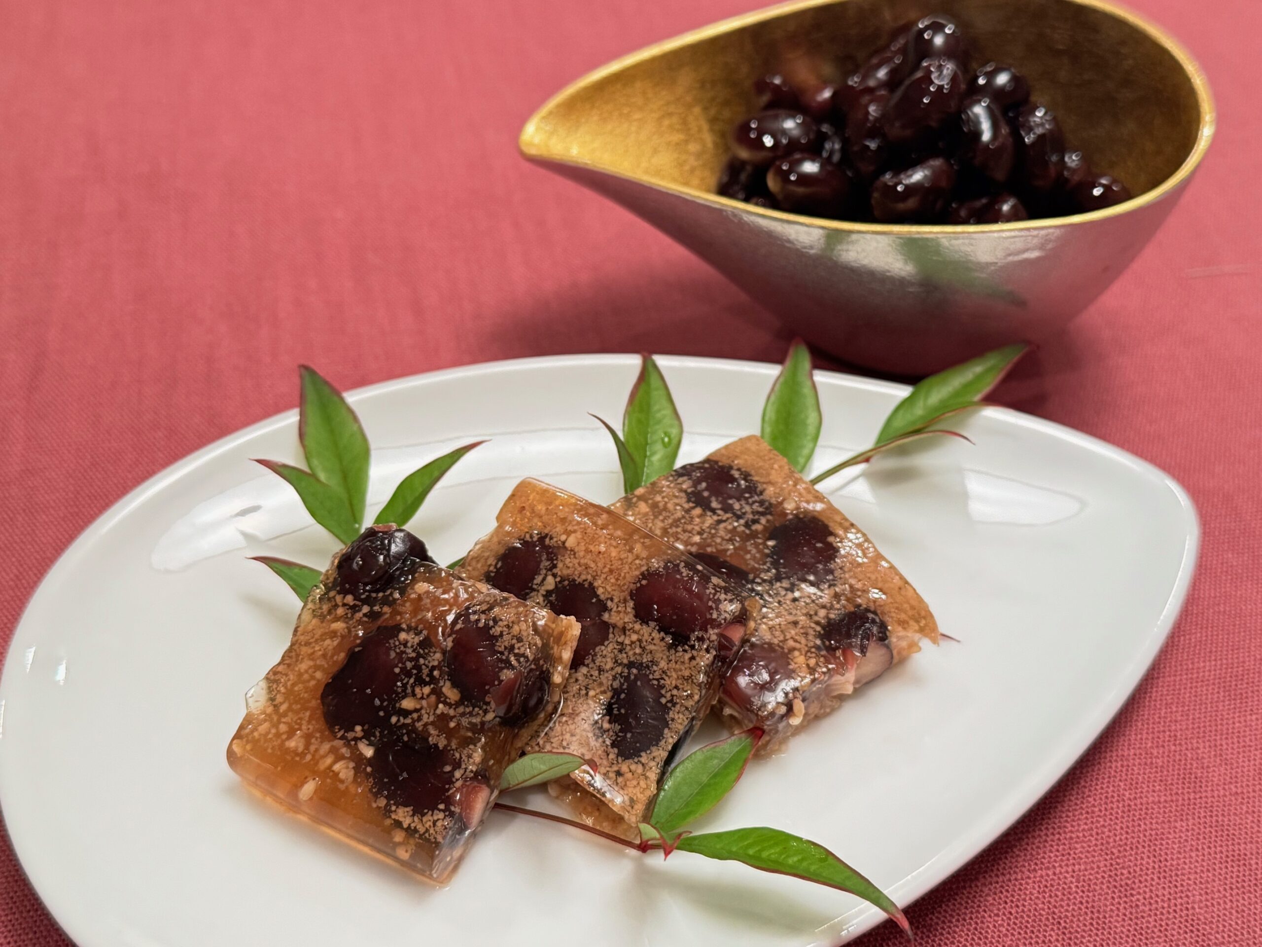 黒豆はスプーンですくって自然に煮汁が入る感じで計量してください。寒天は常温で固まり、常温でも溶けないので、扱いが簡単。保存容器から必要な分だけ出して、そのまま冷蔵庫で保存しましょう。