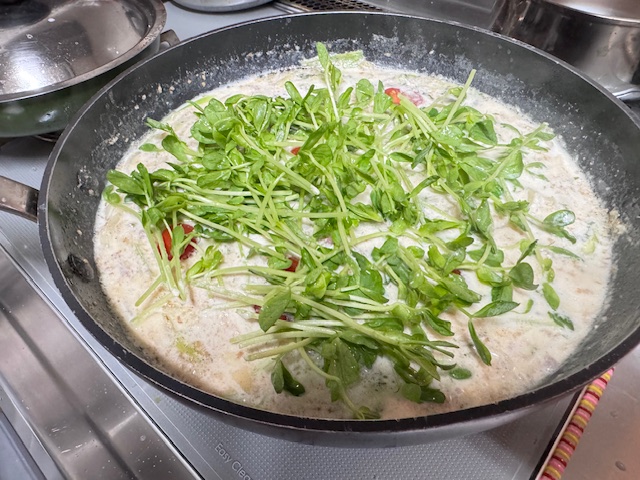 - 冷凍うどんに火が通ったら、豆苗とミニトマトを加え、完成。