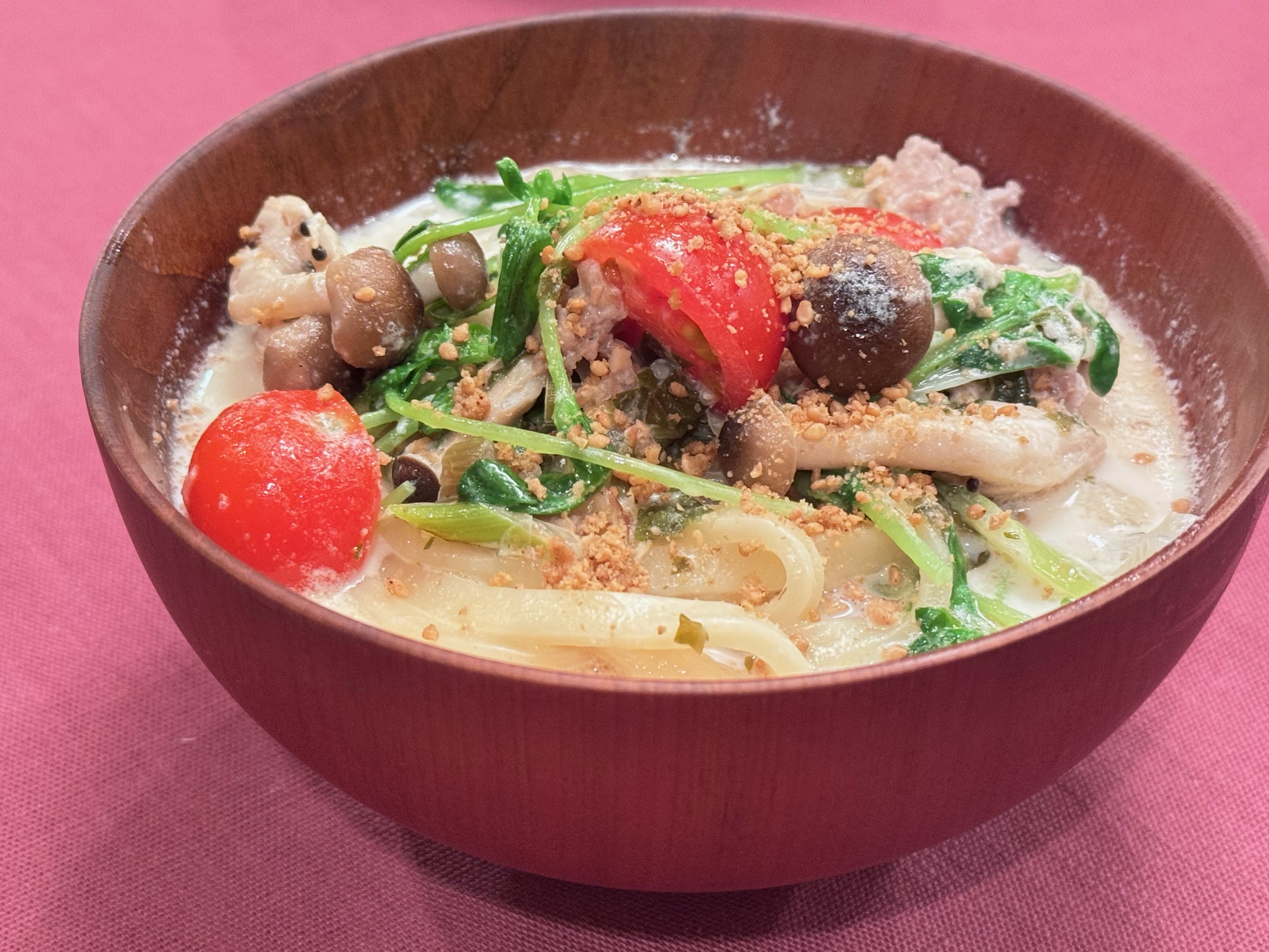 - ①に牛乳と水を加え、みそ玉を3個加えて、溶く。うどんも加える。